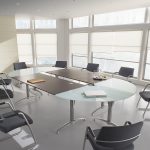 - Salle de réunion: ensemble de tables polyvalentes fixées entre elles par des pieds fixes + chaise visiteur assise tapissé tissu noir et dossier filet vert anis