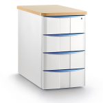 Caisson hauteur bureau ou sur roulettes, mélaminé, stratifié, ou métallique, avec plumier, 2 ou 3 tiroirs à extraction totale, serrure centralisée avec clé rabattable, coloris au choix selon nuancier.